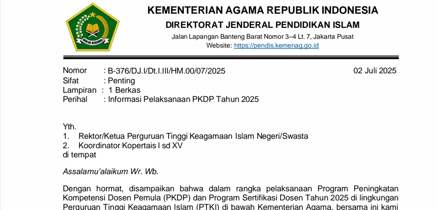 KABARFRESH.COM – Direktorat Jenderal Pendidikan Islam, Direktorat Pendidikan Tinggi Keagamaan Islam (PTKI), Kementrian Agama RI, melalui surat pemberitahuan Nomor B-376/DJ.I/Dt.I.III/HM.00/07/2025, resmi membuka pendaftaran Program Peningkatan Kompetensi Dosen Pemula (PKDP) Tahun 2025.